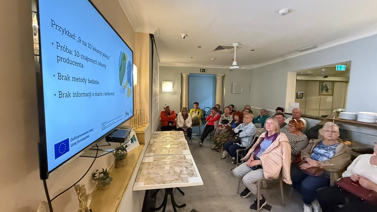 Po przerwie obiadowej odbyły się warsztaty z zakresu dezinformacji i sztucznej inteligencji „Jak dane są przekształcane w mediach i mediach społecznościowych?”. Seniorzy uczyli się, jak rozpoznawać manipulacje wizualne – błędne wykresy, nieproporcjonalne infografiki czy nieprecyzyjne zestawienia danych. Analizowali przykłady z prasy i internetu, a następnie wspólnie wskazywali, jakie zabiegi graficzne mogą wprowadzać odbiorców w błąd. W trakcie dyskusji pojawił się również ważny wątek dezinformacji klimatycznej – uczestnicy analizowali, jak niektóre media i portale społecznościowe zniekształcają dane dotyczące zmian klimatycznych i jak ważna jest rzetelna interpretacja faktów w tym obszarze.