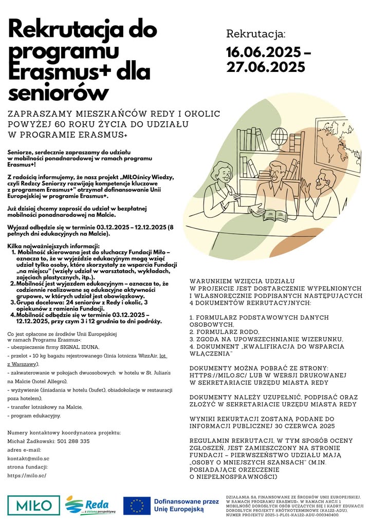 Z radością informujemy, że nasz projekt „MIŁOśnicy Wiedzy, czyli Redzcy Seniorzy rozwijają kompetencje kluczowe z programem Erasmus+” otrzymał dofinansowanie Unii Europejskiej w programie Erasmus+.