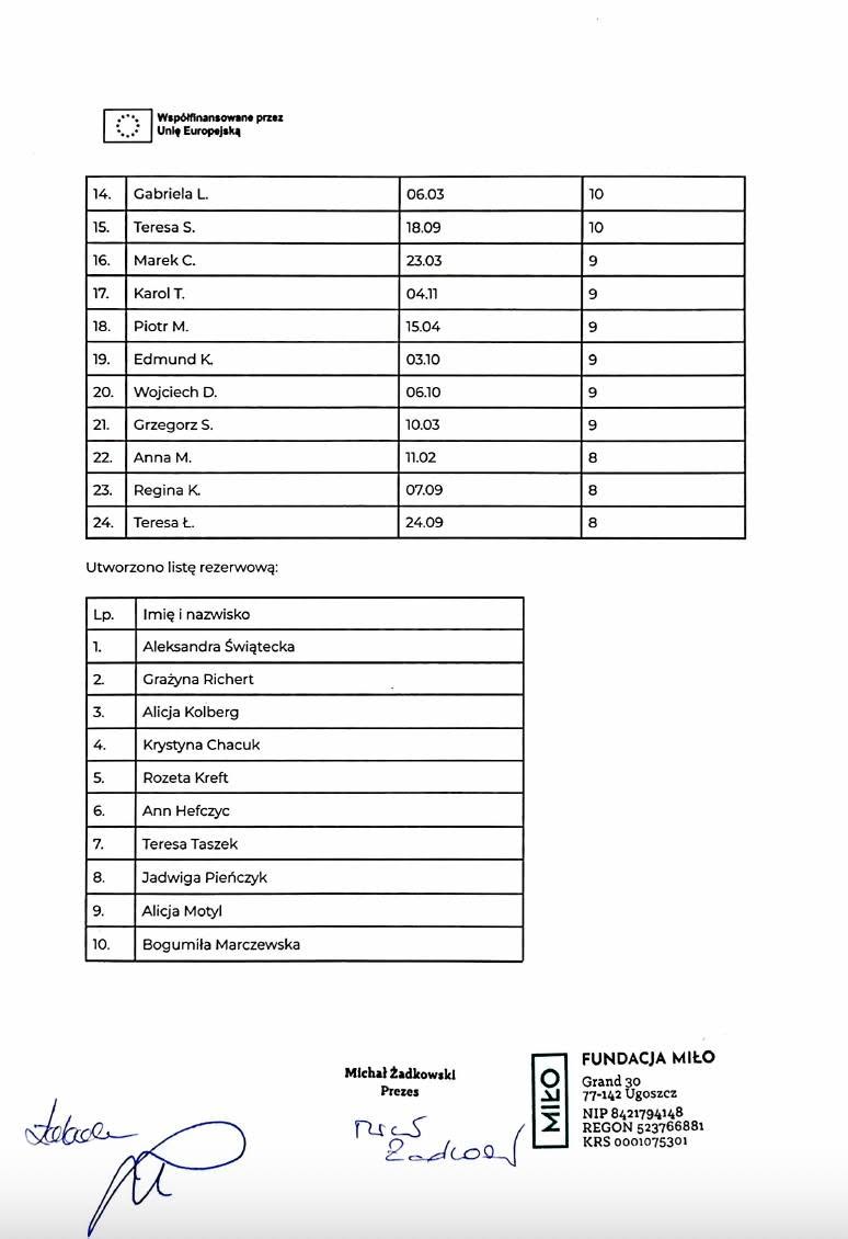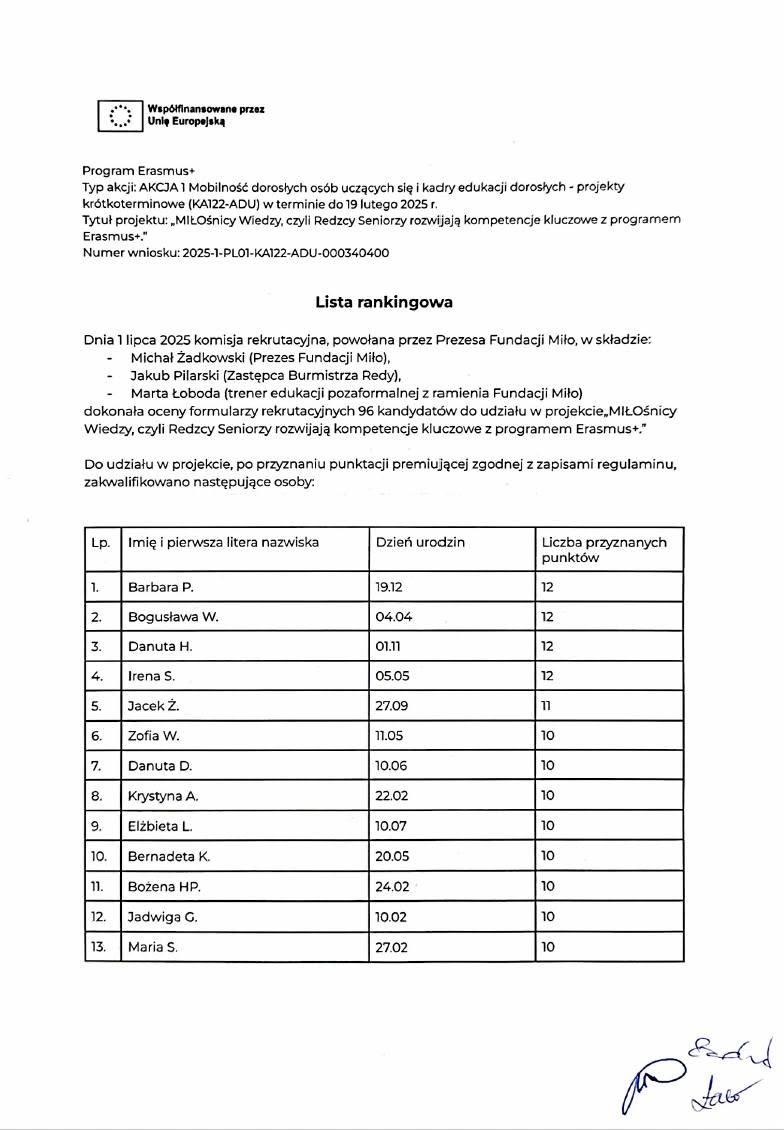Miło jest nam ogłosić, że… znamy listę uczestników projektu „MIŁOśnicy Wiedzy, czyli Redzcy Seniorzy rozwijają kompetencje kluczowe z programem Erasmus+” w programie Erasmus+! Dnia 1 lipca 2025 komisja rekrutacyjna, powołana przez Prezesa Fundacji Miło dokonała oceny formularzy rekrutacyjnych 96 kandydatów do udziału w projekcie„MIŁOśnicy Wiedzy, czyli Redzcy Seniorzy rozwijają kompetencje kluczowe z programem Erasmus+.” W dniach 02.07 – 03.07 koordynator projektu skontaktuje się telefonicznie z zakwalifikowanymi osobami w celu potwierdzenia chęci udziału w projekcie. Działania są finansowane ze środków Unii Europejskiej, w ramach programu Erasmus+, w ramach AKCJI 1 Mobilność dorosłych osób uczących się i kadry edukacji dorosłych projekty krótkoterminowe (KA122-ADU), numer projektu 2025-1-PL01-KA122-ADU-000340400.